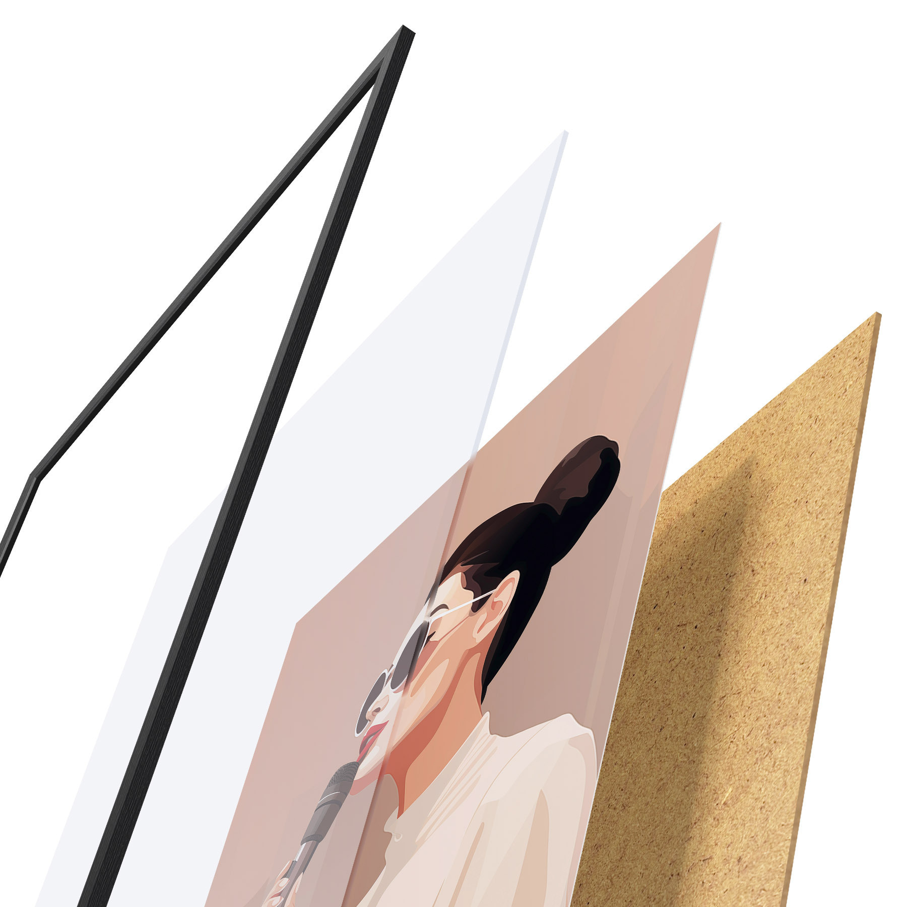 L’affiche encadrée est composée d’un cadre, d’un plexiglas, d’une image imprimée et d’un support en aggloméré. Elle est prête à être accrochée au mur grâce aux fixations situées à l’arrière.