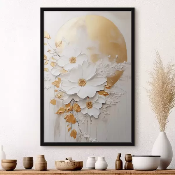 Poster Fleurs blanches rehaussées de touches jaunes et feuilles délicates sur fond texturé, art moderne Nr f47414
