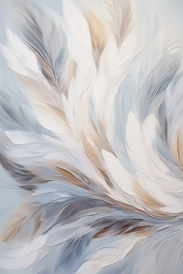 Poster Peinture abstraite représentant des plumes dans des tons blancs, bleus et bruns, avec une texture douce et fluide et un fond clair. Nr f47417