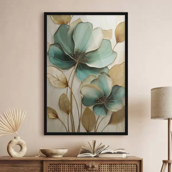 Poster Grandes fleurs bleu sarcelle et jaunes avec contours, entourées de feuilles jaunes sur fond abstrait Nr f47418