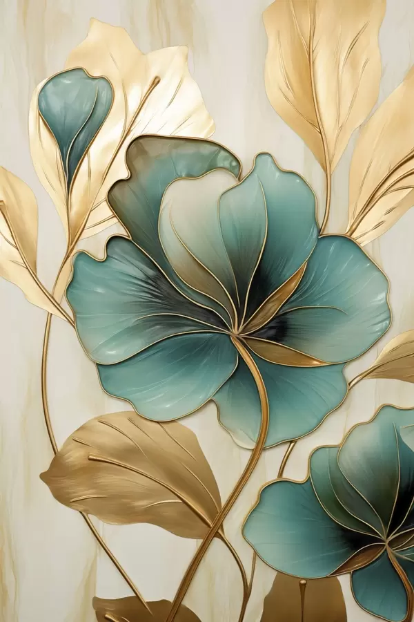 Poster Grandes fleurs bleu sarcelle et jaunes avec contours, entourées de feuilles jaunes sur fond abstrait Nr f47419