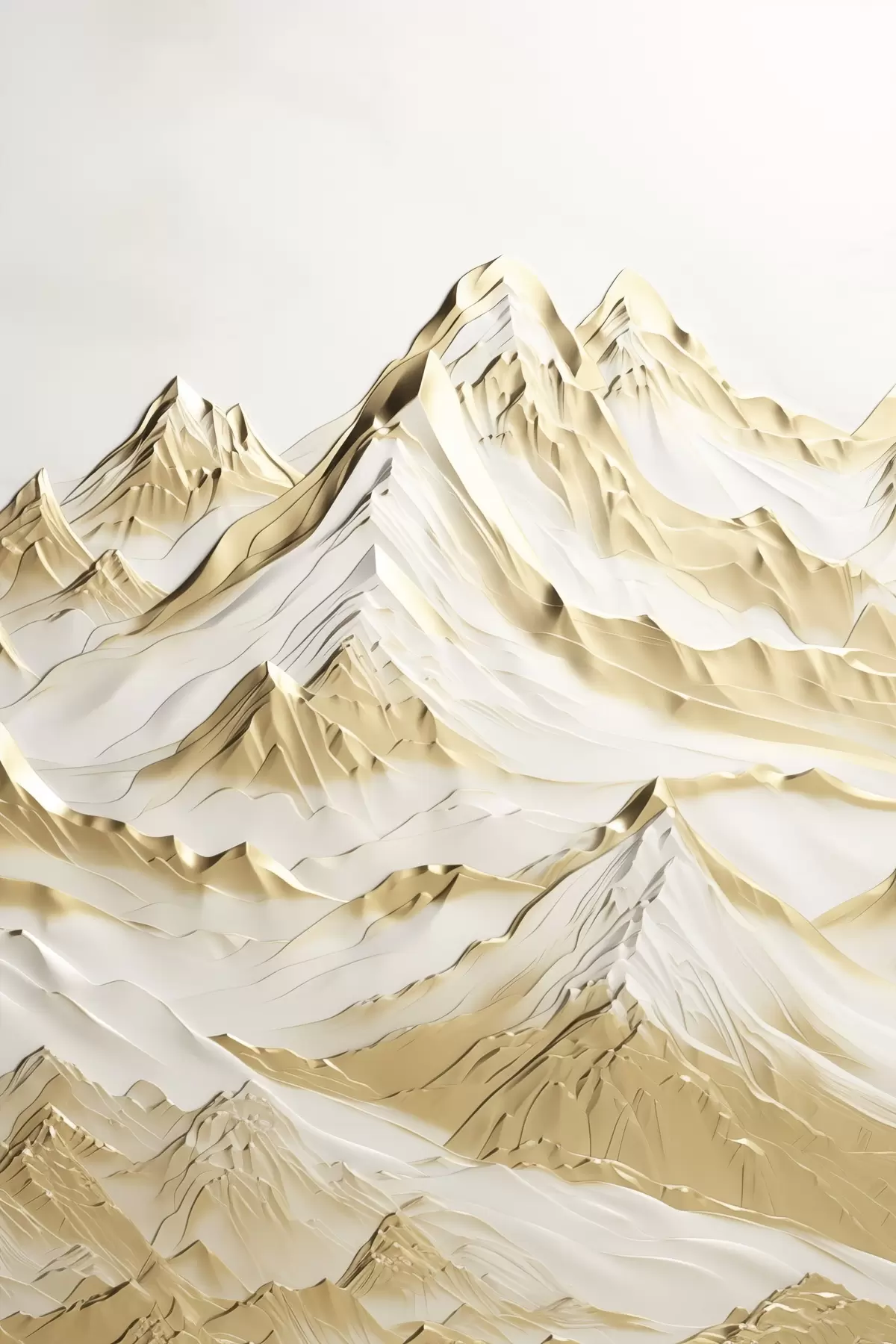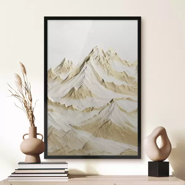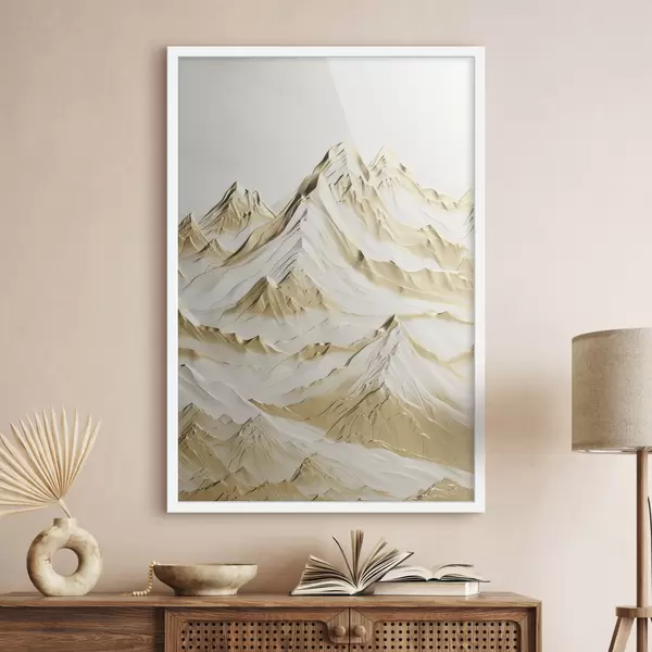 Poster Un paysage de montagnes jaunes enneigées aux pics acérés et aux vallées profondes sous un ciel clair. f47420