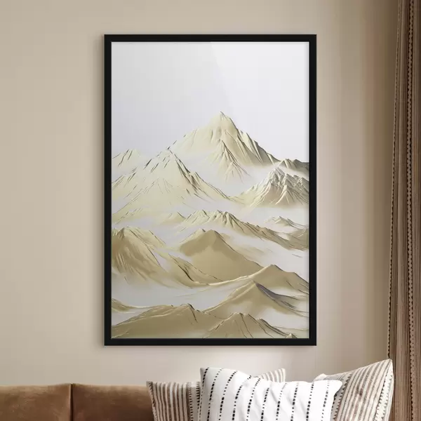 Poster Un paysage de montagnes jaunes enneigées aux pics acérés et aux vallées profondes sous un ciel clair. Nr f47421