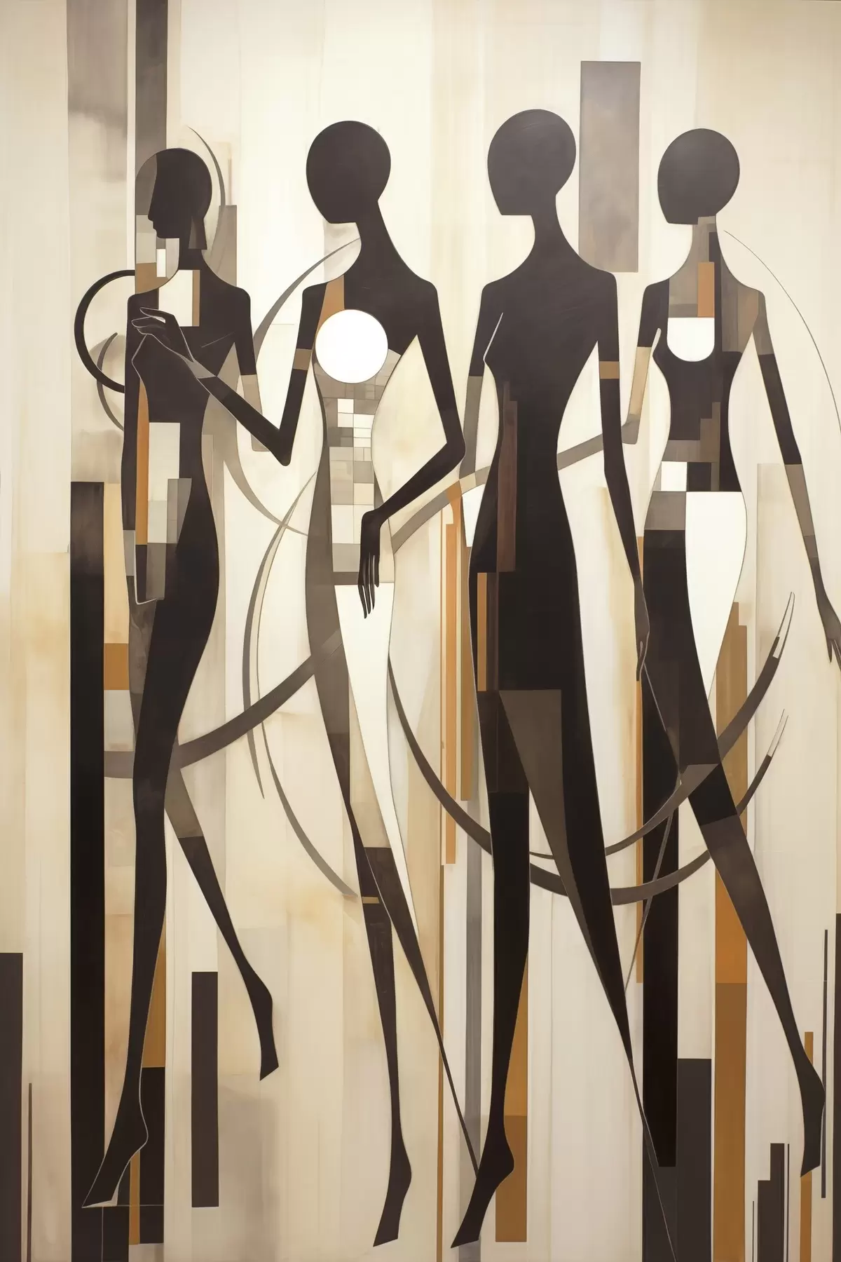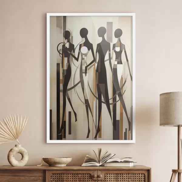 Poster Figures féminines stylisées avec des éléments géométriques sur un fond abstrait de lignes verticales Nr f47423