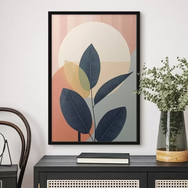 Poster Feuilles sombres sur fond de formes abstraites dans les tons pêche et gris, avec un grand cercle jaune pâle. f47424