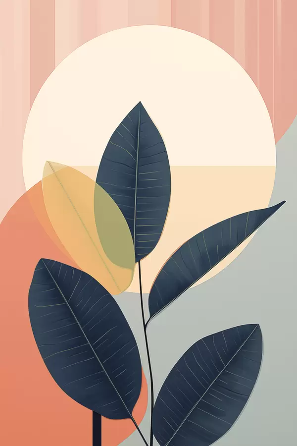 Poster Feuilles sombres sur fond de formes abstraites dans les tons pêche et gris, avec un grand cercle jaune pâle. f47424
