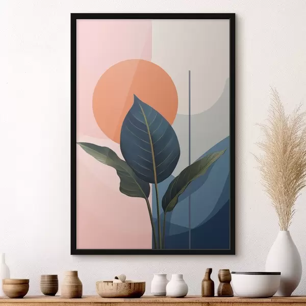 Poster Feuilles sombres sur fond de formes abstraites dans les tons pêche et gris avec un cercle orange Nr f47425