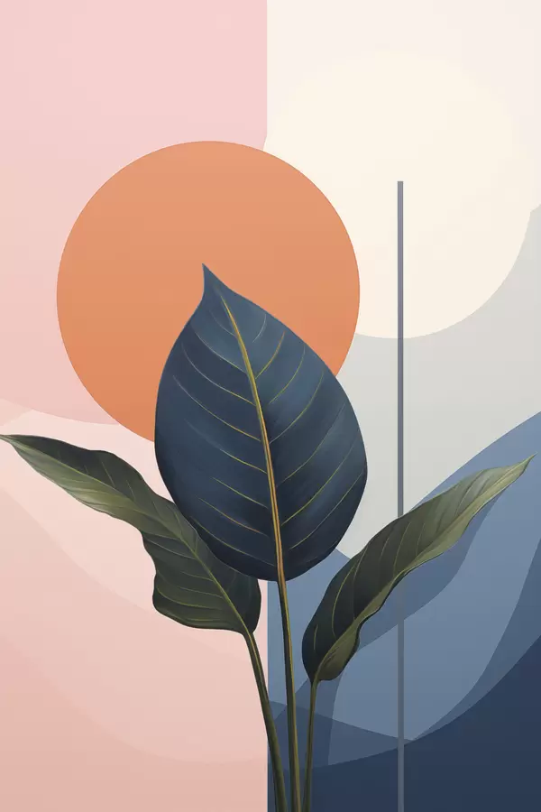 Poster Feuilles sombres sur fond de formes abstraites dans les tons pêche et gris avec un cercle orange Nr f47425