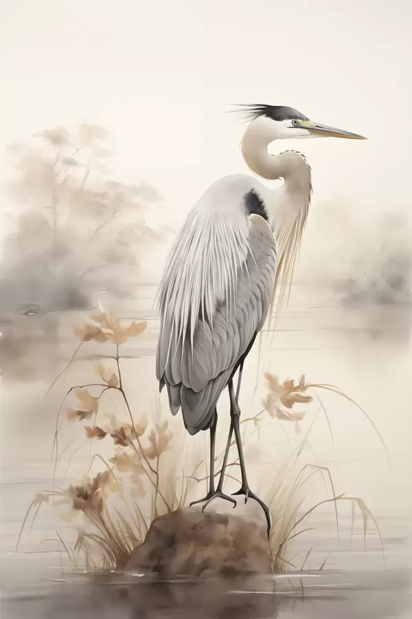 Poster Un héron se tient sur un rocher dans un lac, avec de hautes herbes et des arbres en arrière-plan. Nr f47426