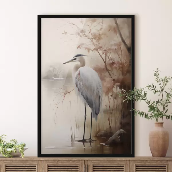 Poster Un héron se tient sur un rocher dans un lac, avec de hautes herbes et des arbres en arrière-plan. Nr f47427