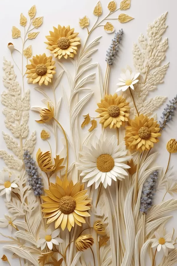 Poster Une collection texturée de marguerites jaunes et blanches avec des herbes séchées et des brins de lavande sur fond blanc. f47430