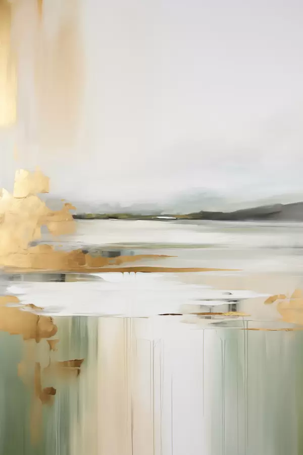 Poster Paysage abstrait aux tons jaunes et verts, eau reflétant le ciel et les montagnes lointaines, ciel pâle et brumeux Nr f47438
