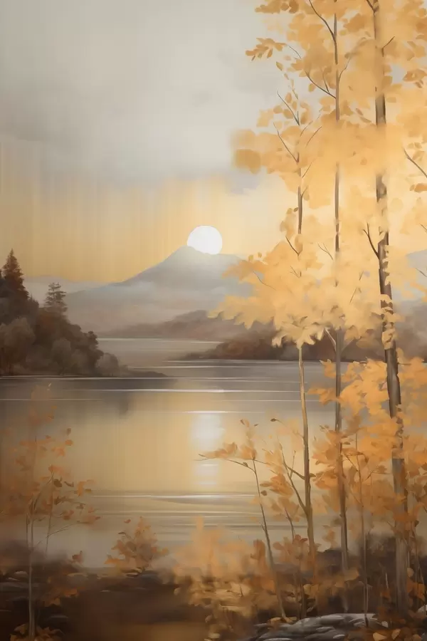 Poster Des arbres aux feuilles orange, caractéristiques de l'automne, encadrent un lac paisible avec des montagnes lointaines sous un ciel nuageux. Nr f47440