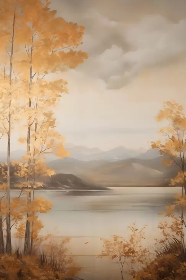 Poster Des arbres aux feuilles orange, caractéristiques de l'automne, encadrent un lac paisible avec des montagnes lointaines sous un ciel nuageux. Nr f47441