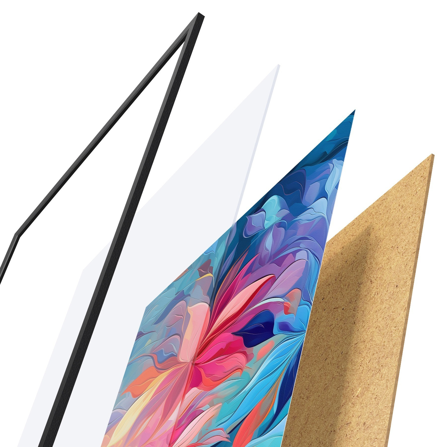 L’affiche encadrée est composée d’un cadre, d’un plexiglas, d’une image imprimée et d’un support en aggloméré. Elle est prête à être accrochée au mur grâce aux fixations situées à l’arrière.