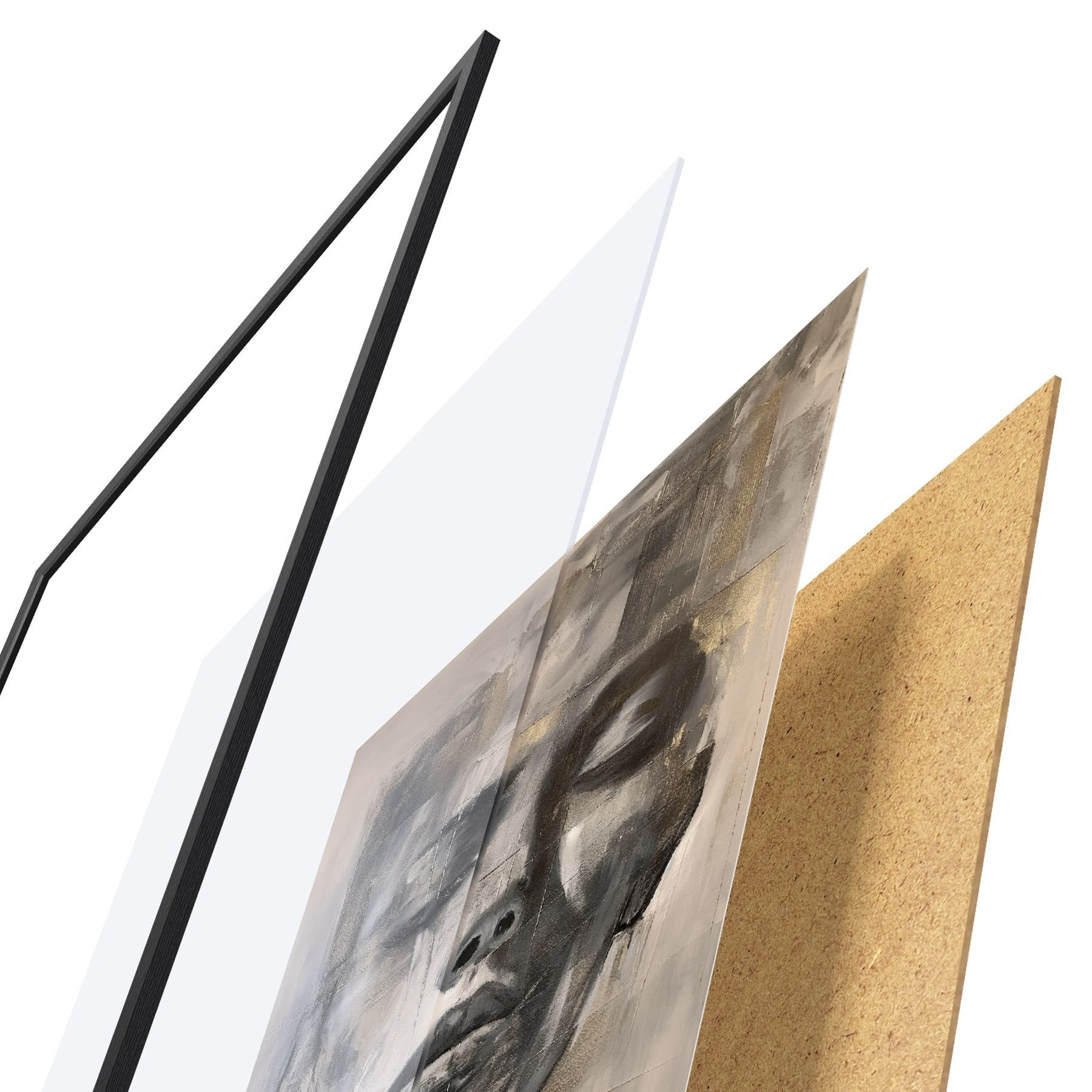 L’affiche encadrée est composée d’un cadre, d’un plexiglas, d’une image imprimée et d’un support en aggloméré. Elle est prête à être accrochée au mur grâce aux fixations situées à l’arrière.