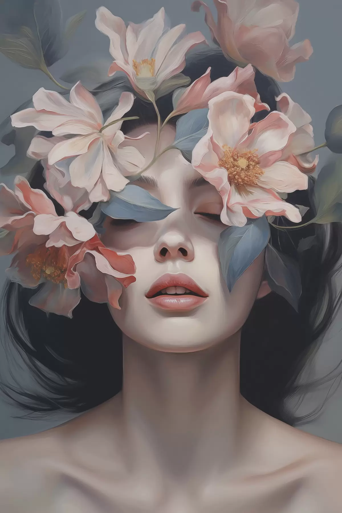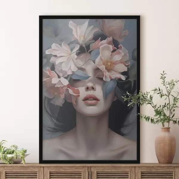 Poster Portrait féminin abstrait avec des fleurs Nr f47488