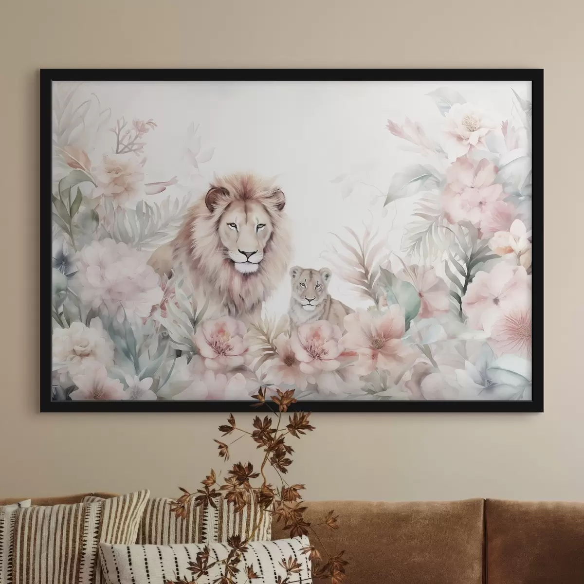 Poster Lions dans les fourrés tropicaux, imitation aquarelle f47640