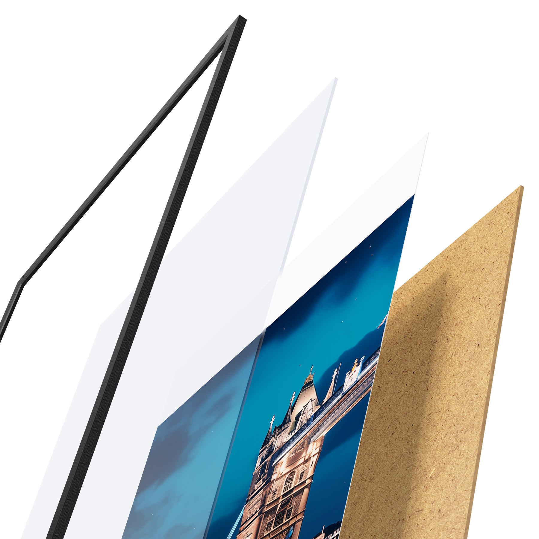 L’affiche encadrée est composée d’un cadre, d’un plexiglas, d’une image imprimée et d’un support en aggloméré. Elle est prête à être accrochée au mur grâce aux fixations situées à l’arrière.