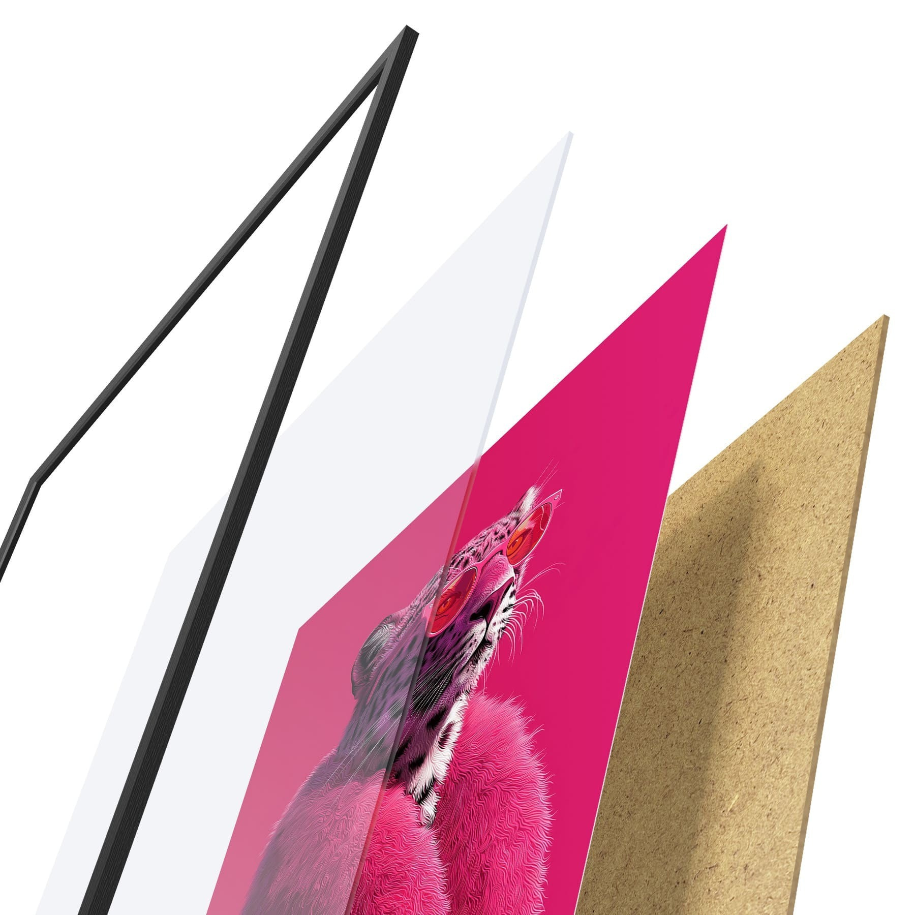 L’affiche encadrée est composée d’un cadre, d’un plexiglas, d’une image imprimée et d’un support en aggloméré. Elle est prête à être accrochée au mur grâce aux fixations situées à l’arrière.