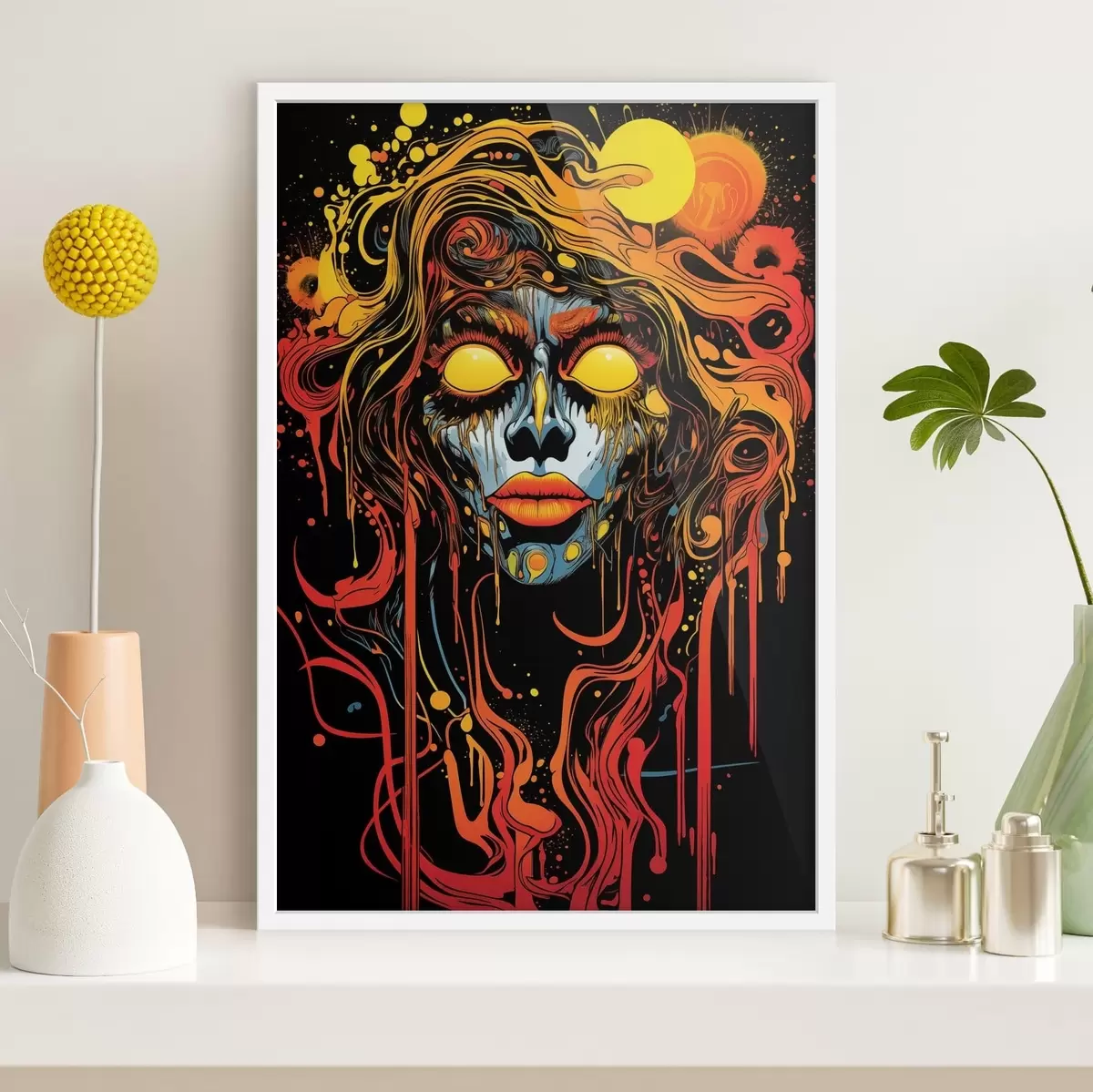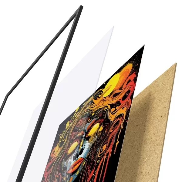 L’affiche encadrée est composée d’un cadre, d’un plexiglas, d’une image imprimée et d’un support en aggloméré. Elle est prête à être accrochée au mur grâce aux fixations situées à l’arrière.