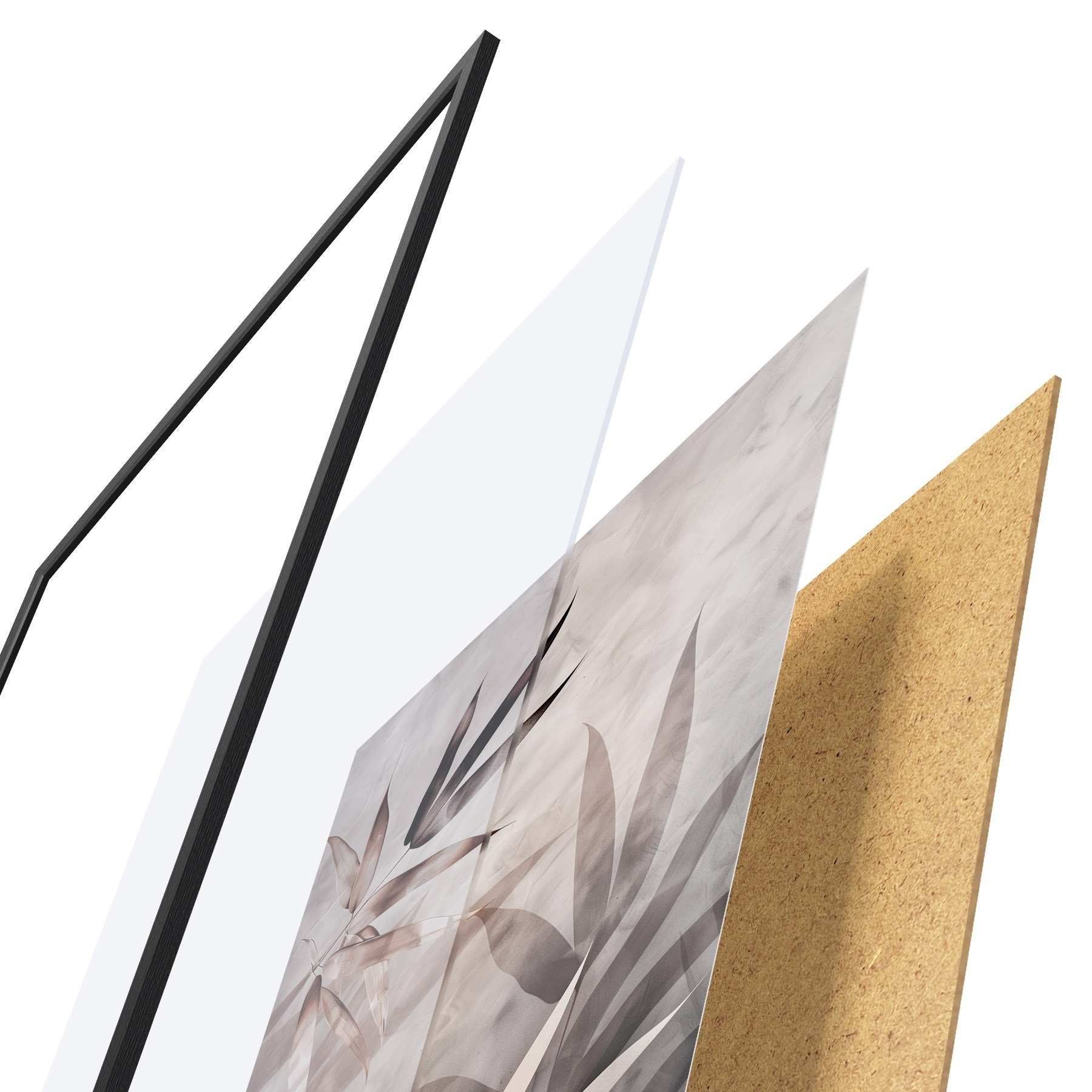 L’affiche encadrée est composée d’un cadre, d’un plexiglas, d’une image imprimée et d’un support en aggloméré. Elle est prête à être accrochée au mur grâce aux fixations situées à l’arrière.