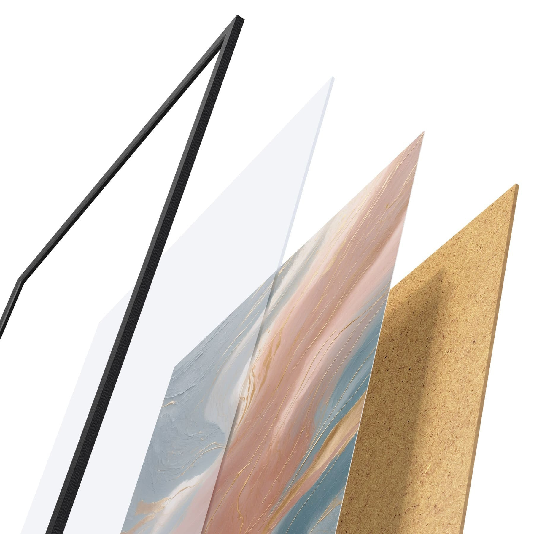 L’affiche encadrée est composée d’un cadre, d’un plexiglas, d’une image imprimée et d’un support en aggloméré. Elle est prête à être accrochée au mur grâce aux fixations situées à l’arrière.