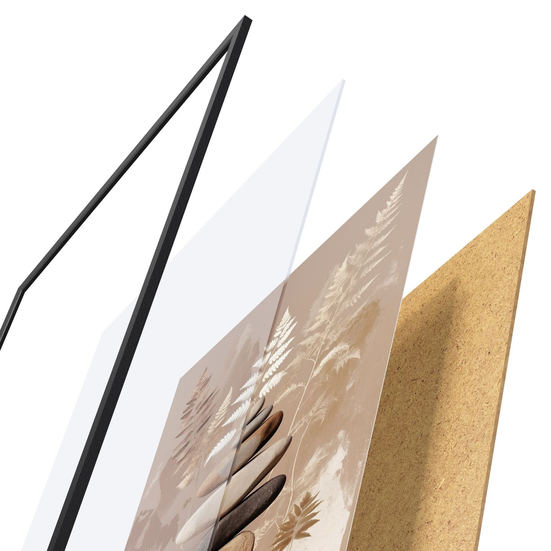 L’affiche encadrée est composée d’un cadre, d’un plexiglas, d’une image imprimée et d’un support en aggloméré. Elle est prête à être accrochée au mur grâce aux fixations situées à l’arrière.