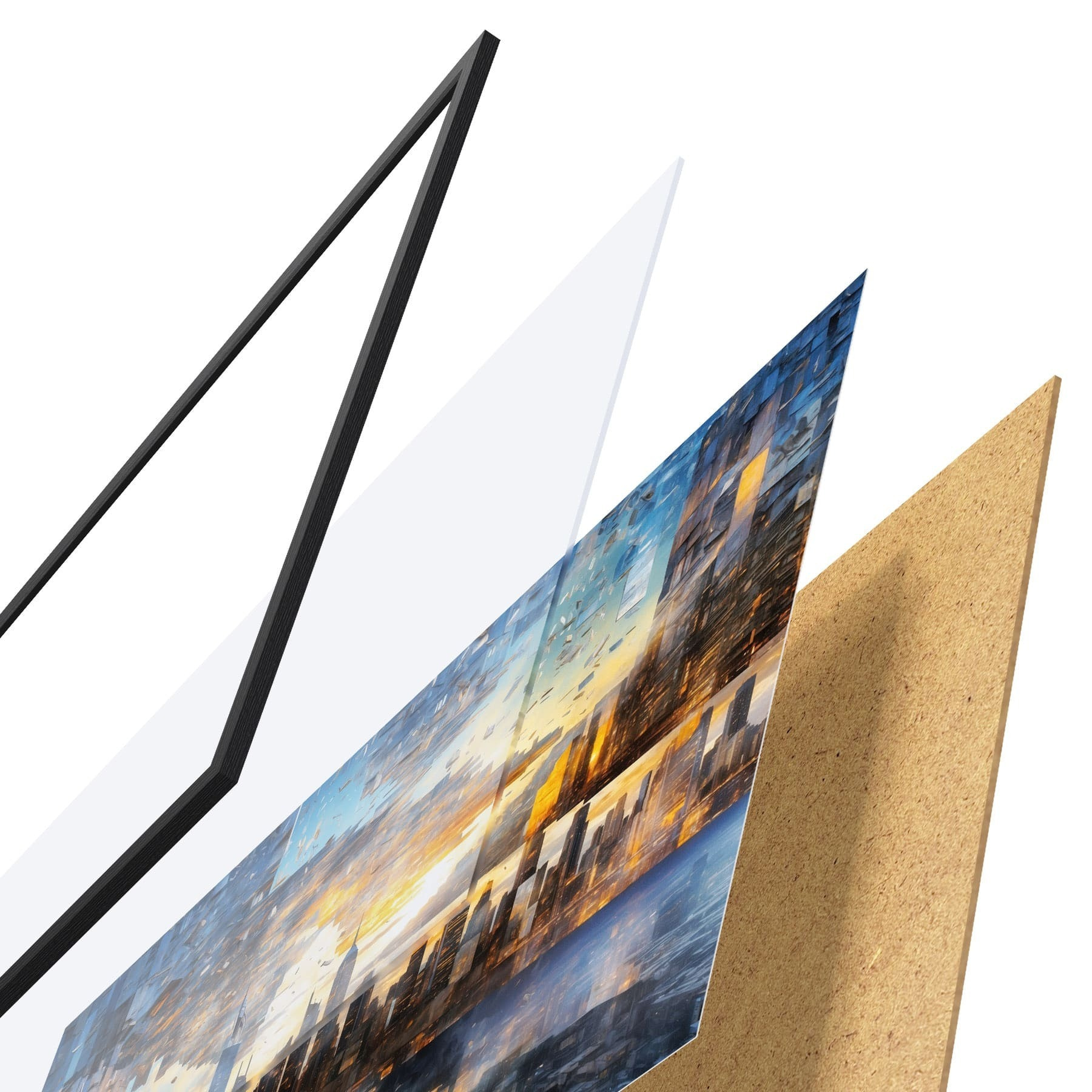 L’affiche encadrée est composée d’un cadre, d’un plexiglas, d’une image imprimée et d’un support en aggloméré. Elle est prête à être accrochée au mur grâce aux fixations situées à l’arrière.