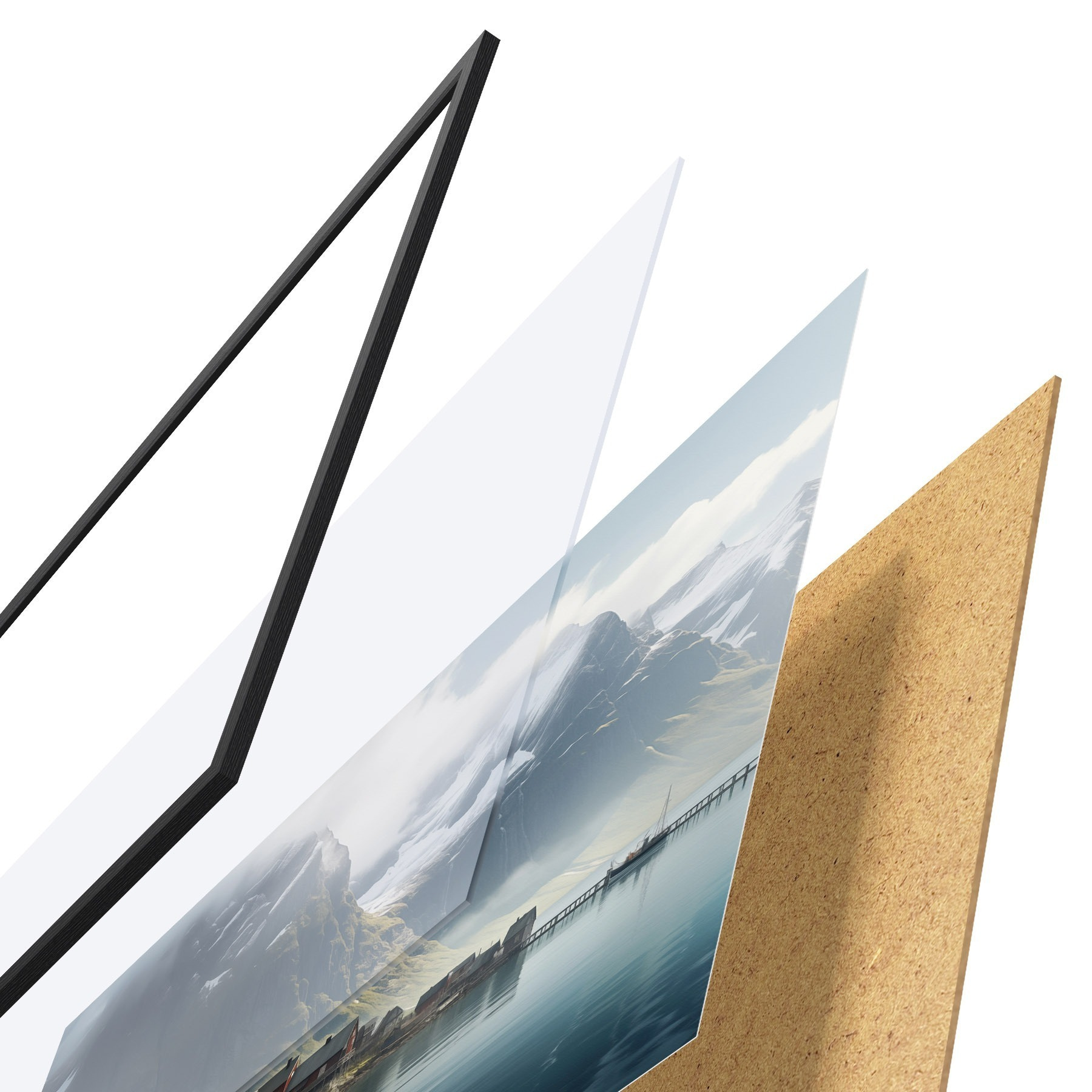 L’affiche encadrée est composée d’un cadre, d’un plexiglas, d’une image imprimée et d’un support en aggloméré. Elle est prête à être accrochée au mur grâce aux fixations situées à l’arrière.