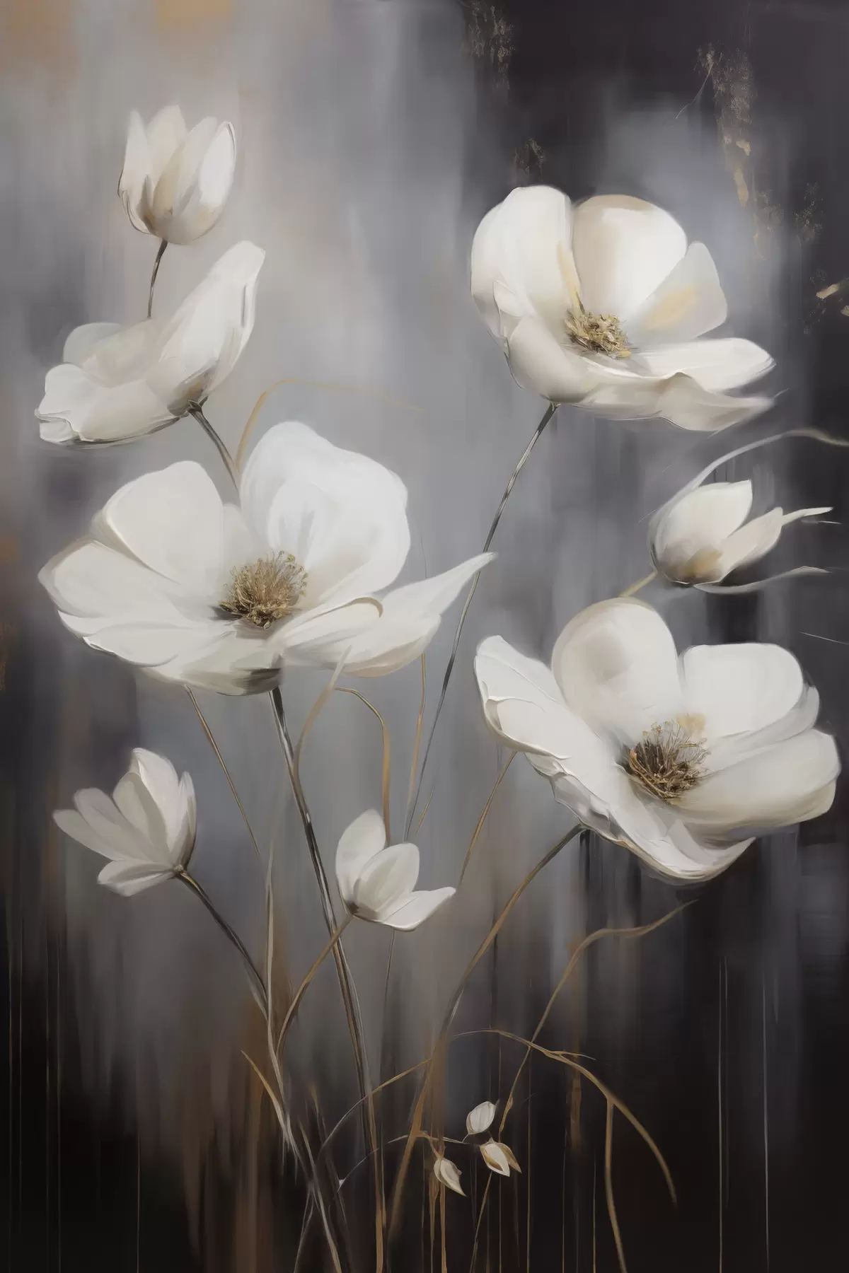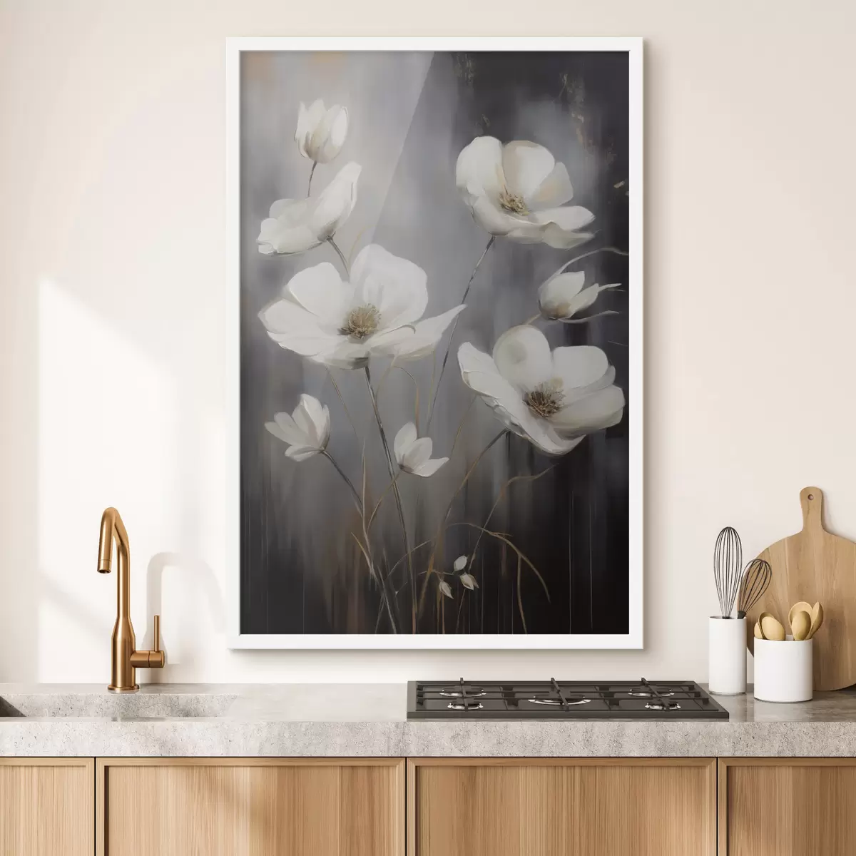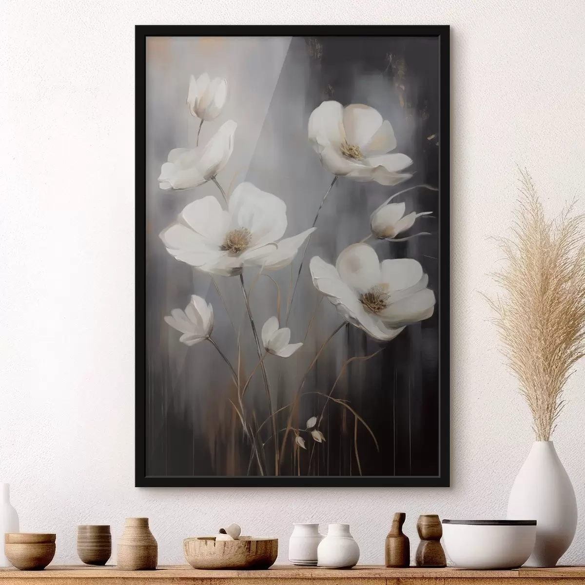 Poster Fleurs blanches au cœur brun et aux tiges fines sur fond sombre et texturé Nr f47858