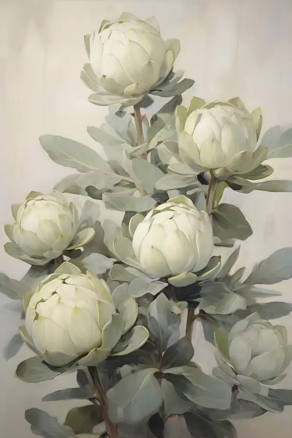 Poster Style pictural représentant plusieurs fleurs de protéa blanches avec de grandes feuilles vertes sur un fond clair. f47861