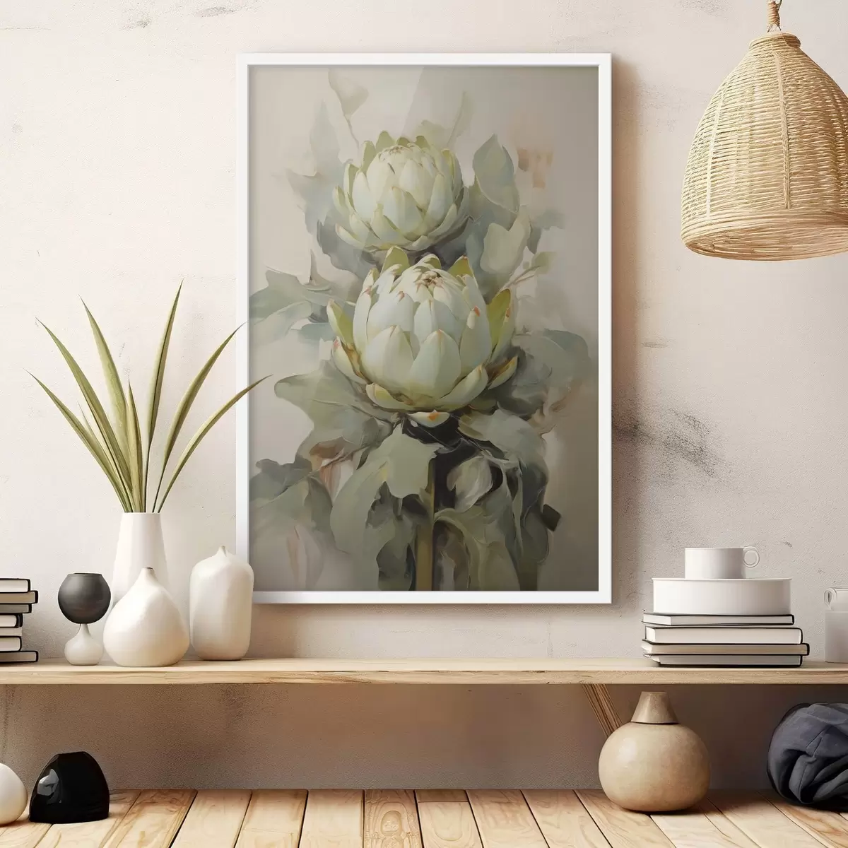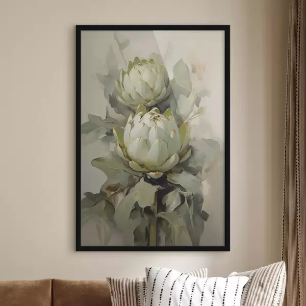 Poster Style pictural représentant plusieurs fleurs de protéa blanches avec de grandes feuilles vertes sur un fond clair. f47862