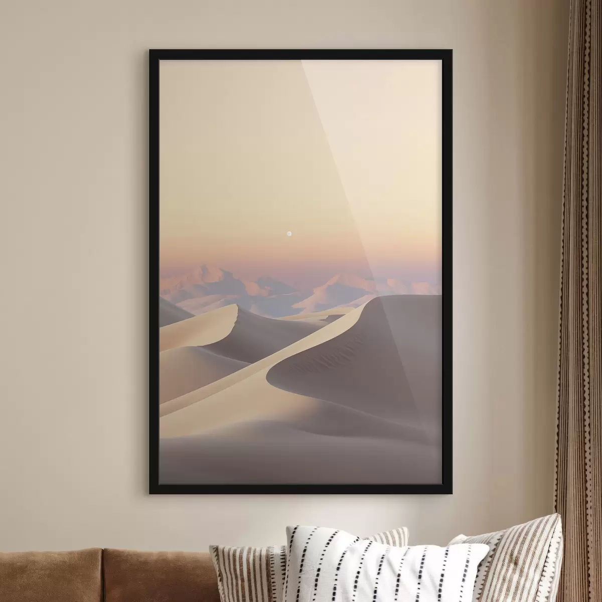 Poster Un paysage désertique avec des dunes de sable ondulantes sous un ciel pastel doux, des montagnes lointaines en arrière-plan. Nr f47865