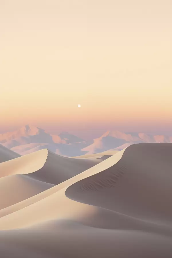 Poster Un paysage désertique avec des dunes de sable ondulantes sous un ciel pastel doux, des montagnes lointaines en arrière-plan. Nr f47865