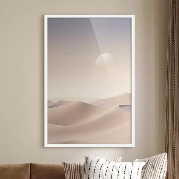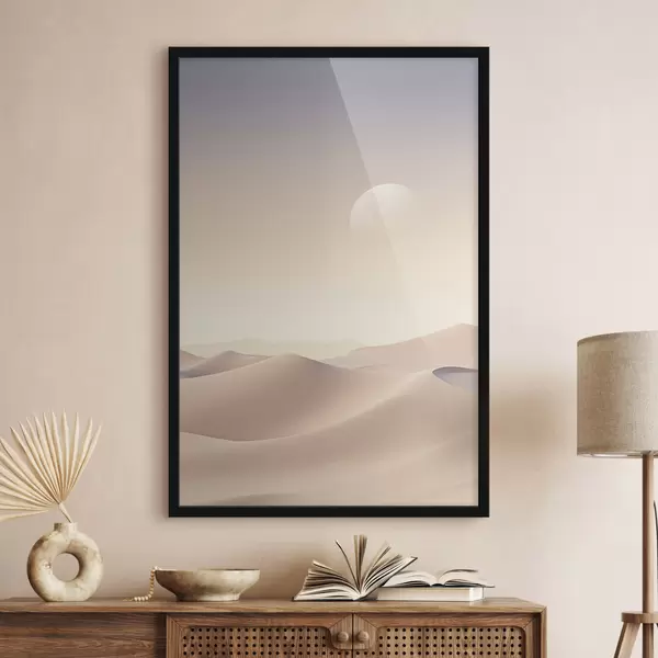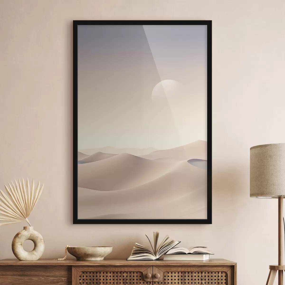 Poster Un paysage désertique avec des dunes de sable ondulantes sous un ciel pastel doux, des montagnes lointaines en arrière-plan. Nr f47866