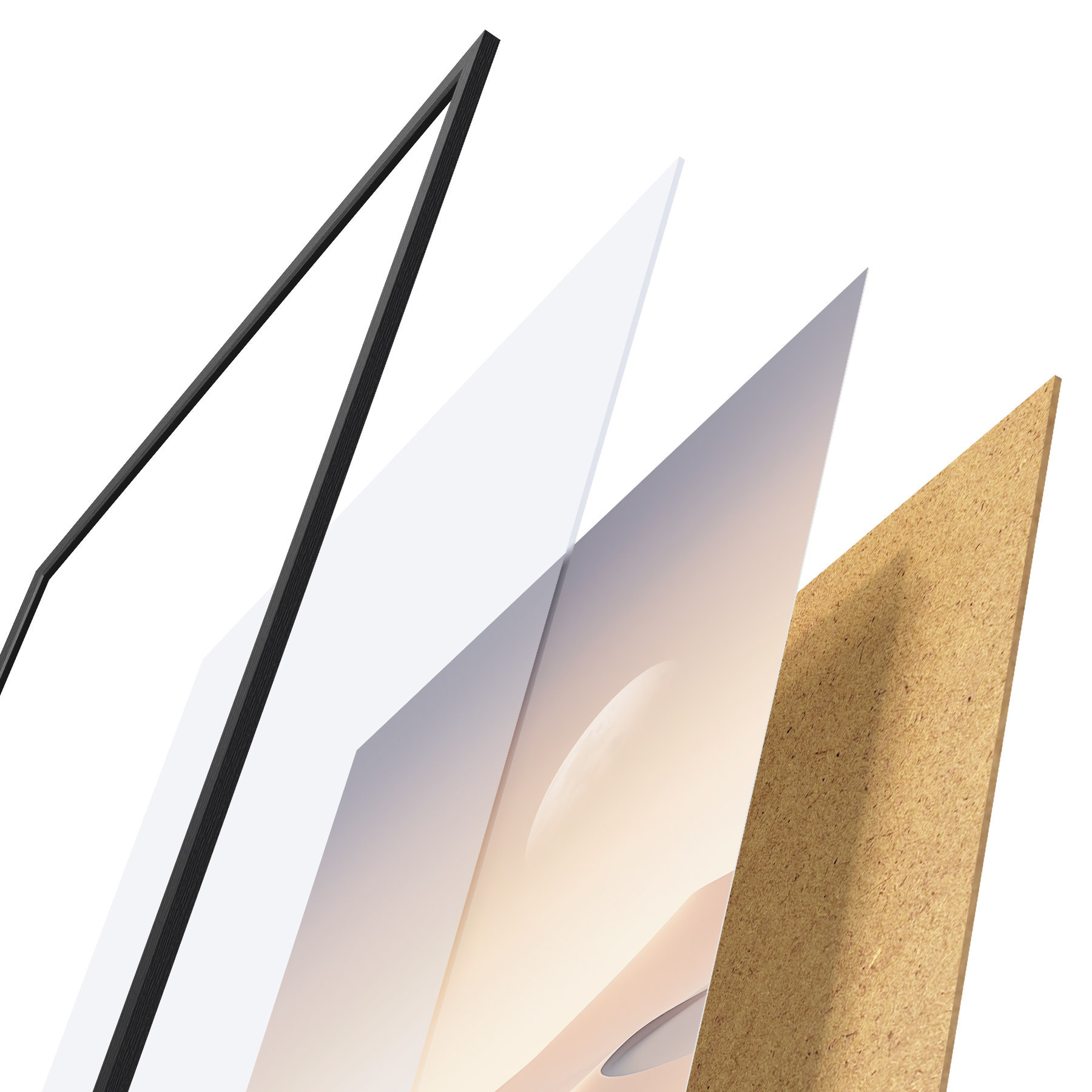 L’affiche encadrée est composée d’un cadre, d’un plexiglas, d’une image imprimée et d’un support en aggloméré. Elle est prête à être accrochée au mur grâce aux fixations situées à l’arrière.