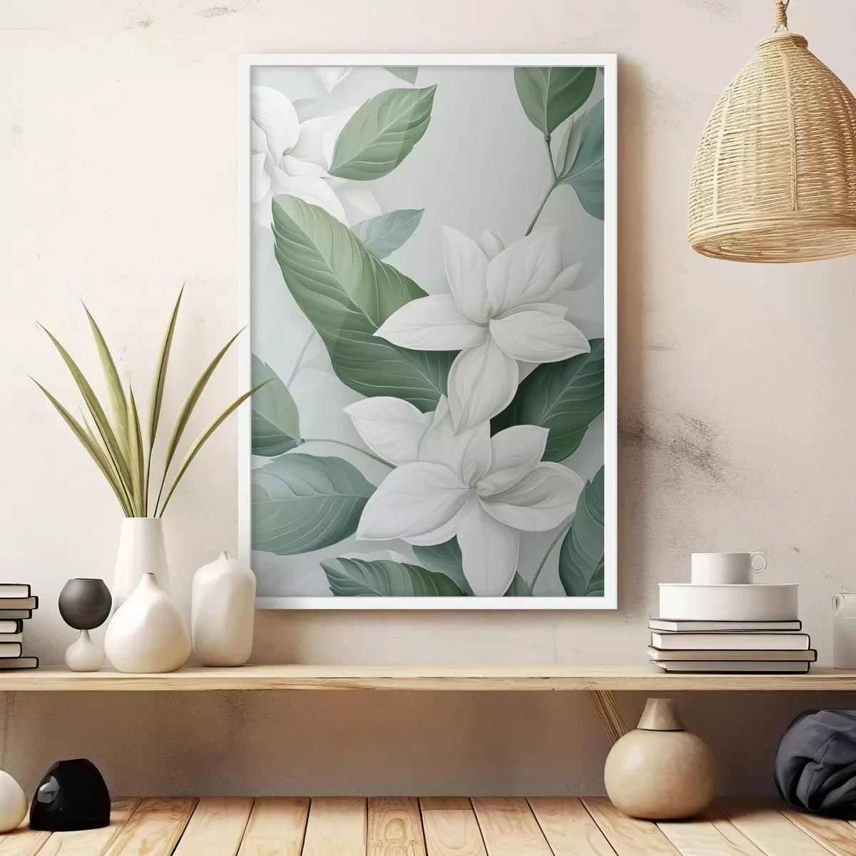 Poster Fleurs blanches avec feuilles vertes, fond pastel Nr f47869