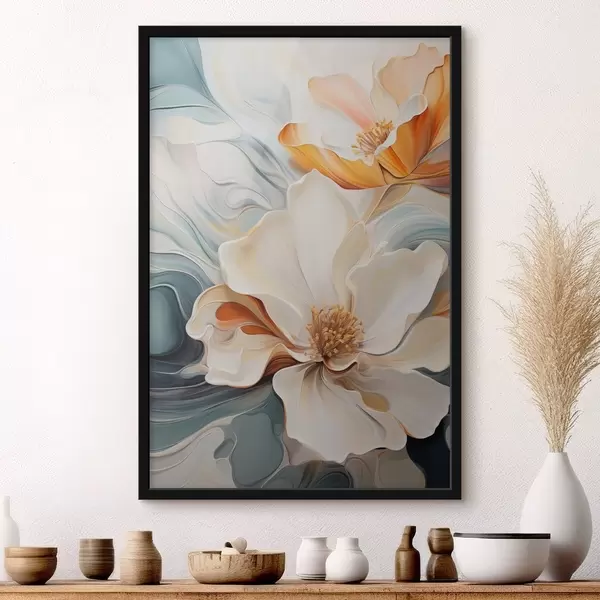 Poster Fleur abstraite de grande taille avec des pétales blancs, orange et bleu sarcelle, fond texturé Nr f47878