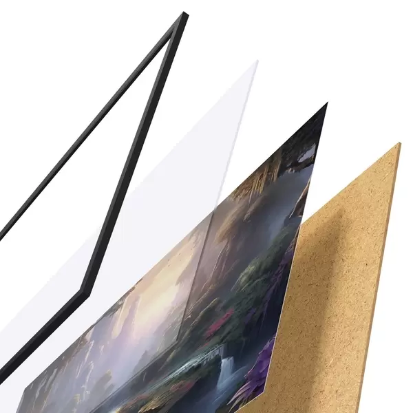 L’affiche encadrée est composée d’un cadre, d’un plexiglas, d’une image imprimée et d’un support en aggloméré. Elle est prête à être accrochée au mur grâce aux fixations situées à l’arrière.