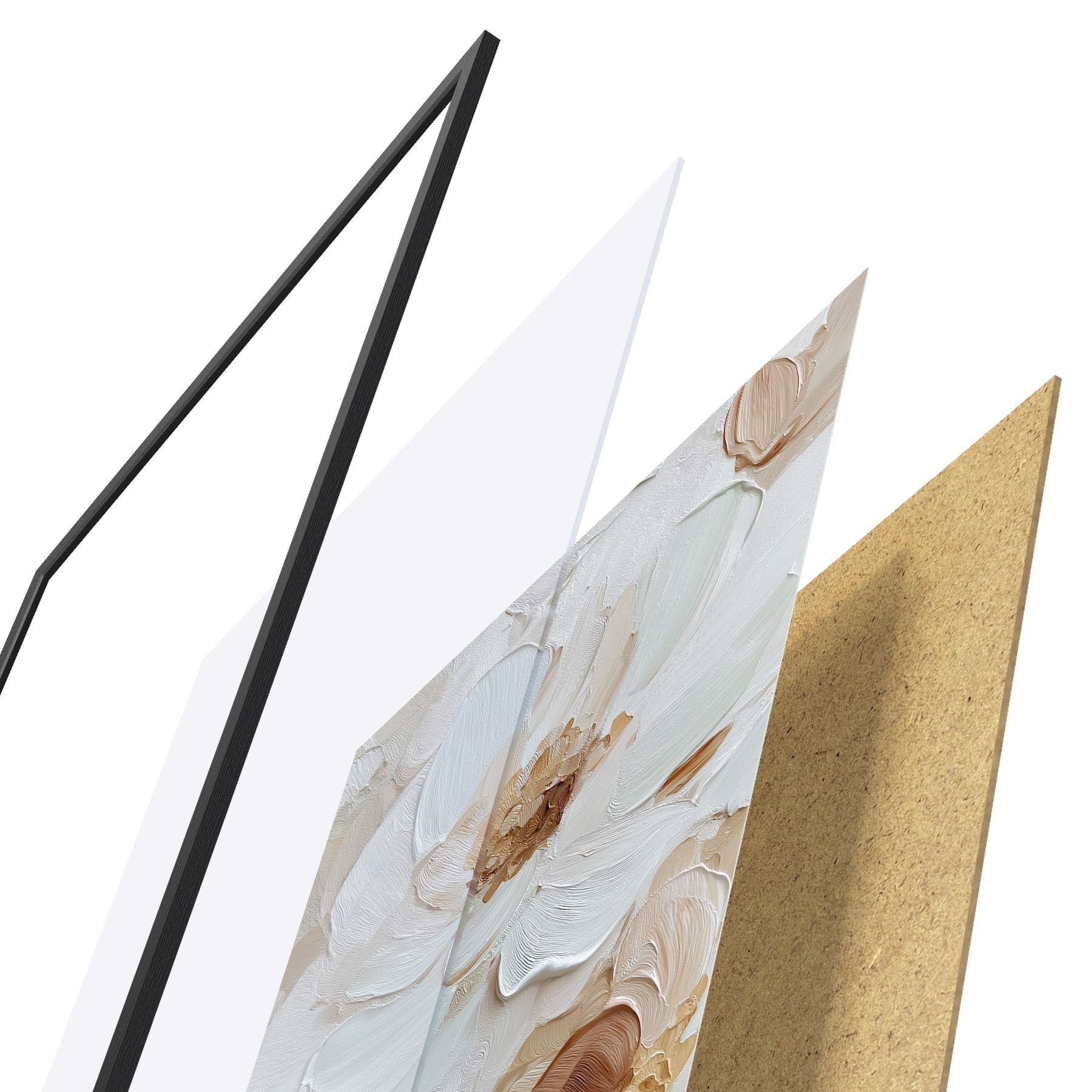 L’affiche encadrée est composée d’un cadre, d’un plexiglas, d’une image imprimée et d’un support en aggloméré. Elle est prête à être accrochée au mur grâce aux fixations situées à l’arrière.