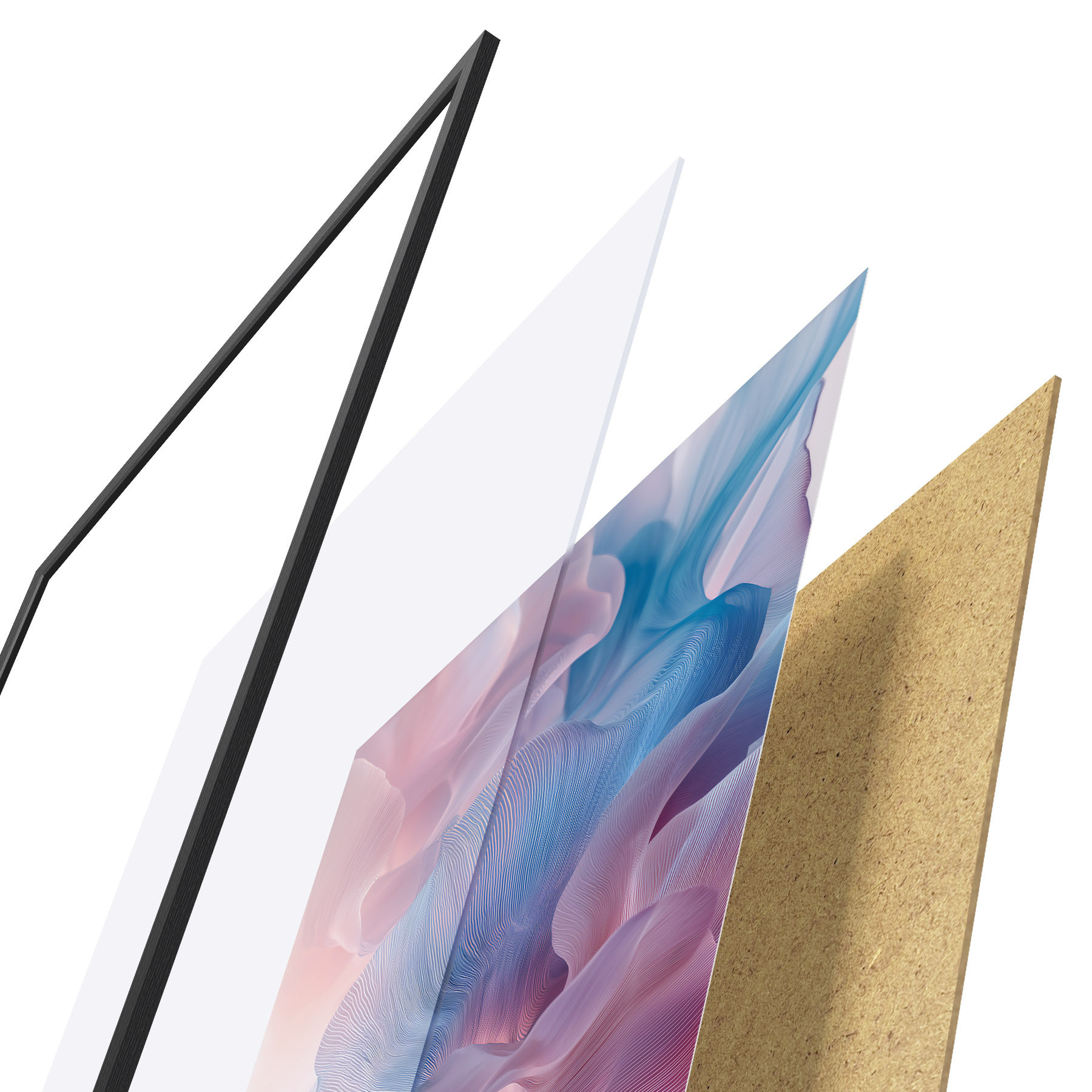 L’affiche encadrée est composée d’un cadre, d’un plexiglas, d’une image imprimée et d’un support en aggloméré. Elle est prête à être accrochée au mur grâce aux fixations situées à l’arrière.