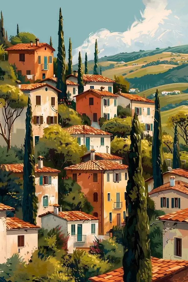 Poster village méditerranéen à flanc de colline, maisons aux tons chauds empilées les unes sur les autres avec des toits en terre cuite f47950