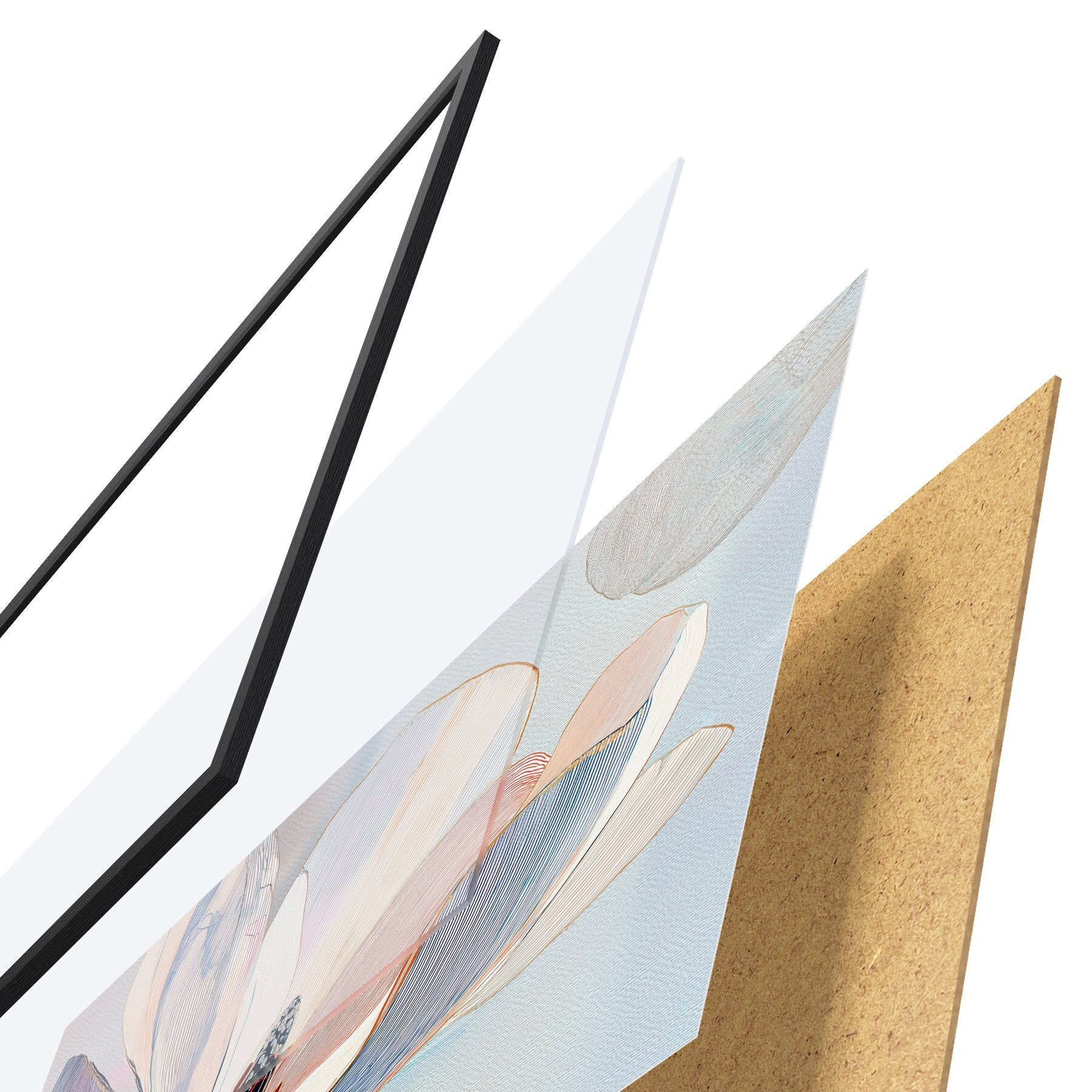 L’affiche encadrée est composée d’un cadre, d’un plexiglas, d’une image imprimée et d’un support en aggloméré. Elle est prête à être accrochée au mur grâce aux fixations situées à l’arrière.