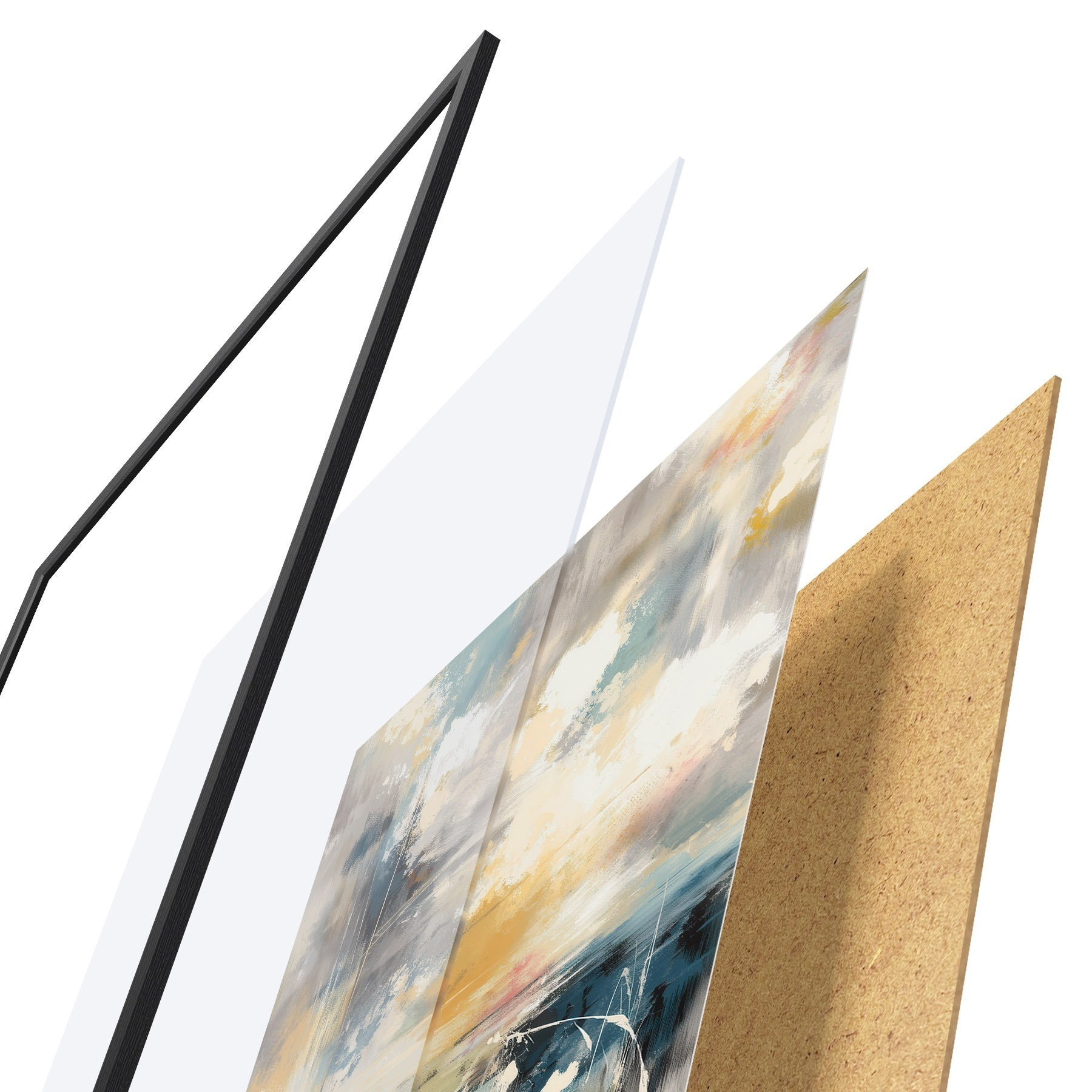 L’affiche encadrée est composée d’un cadre, d’un plexiglas, d’une image imprimée et d’un support en aggloméré. Elle est prête à être accrochée au mur grâce aux fixations situées à l’arrière.