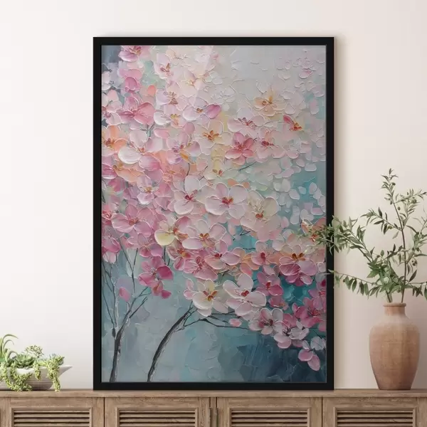 Poster Branche avec des fleurs roses sur fond bleu dans un style peinture à l'huile Nr f47987