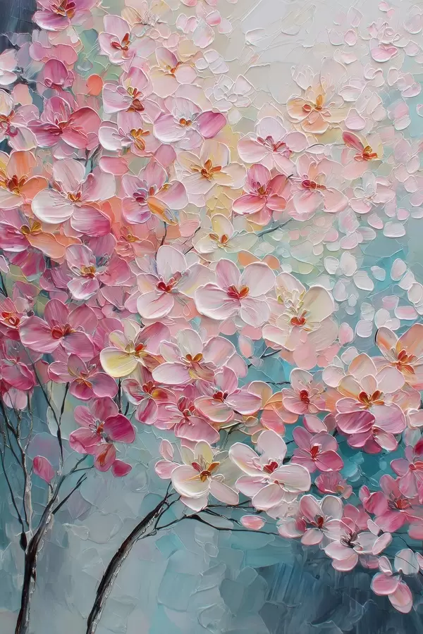 Poster Branche avec des fleurs roses sur fond bleu dans un style peinture à l'huile f47987