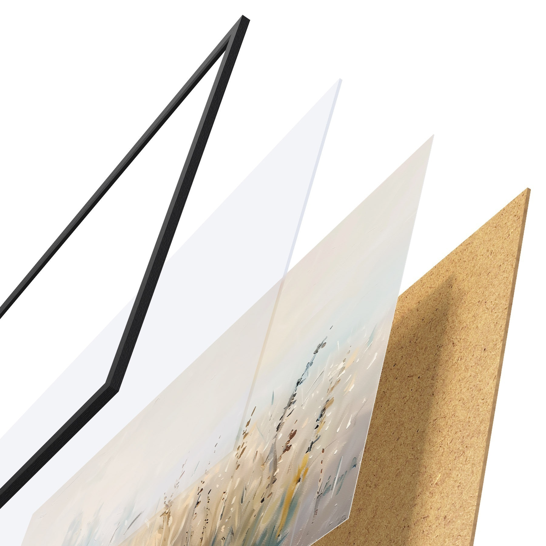 L’affiche encadrée est composée d’un cadre, d’un plexiglas, d’une image imprimée et d’un support en aggloméré. Elle est prête à être accrochée au mur grâce aux fixations situées à l’arrière.