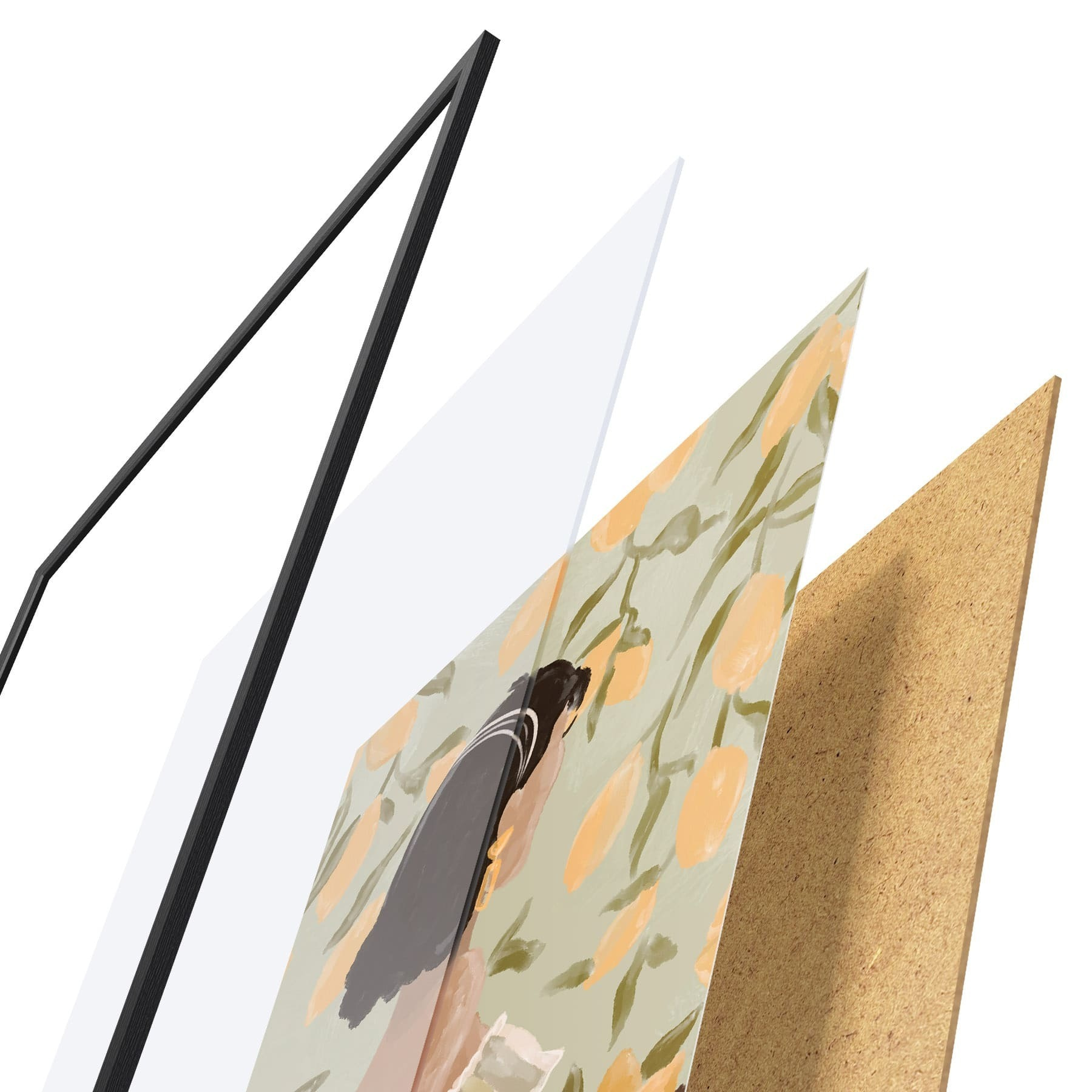 L’affiche encadrée est composée d’un cadre, d’un plexiglas, d’une image imprimée et d’un support en aggloméré. Elle est prête à être accrochée au mur grâce aux fixations situées à l’arrière.