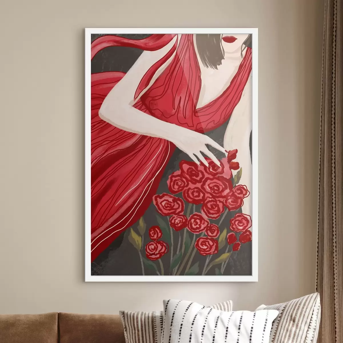 Poster Femme en robe rouge avec un bouquet de roses Nr f48026
